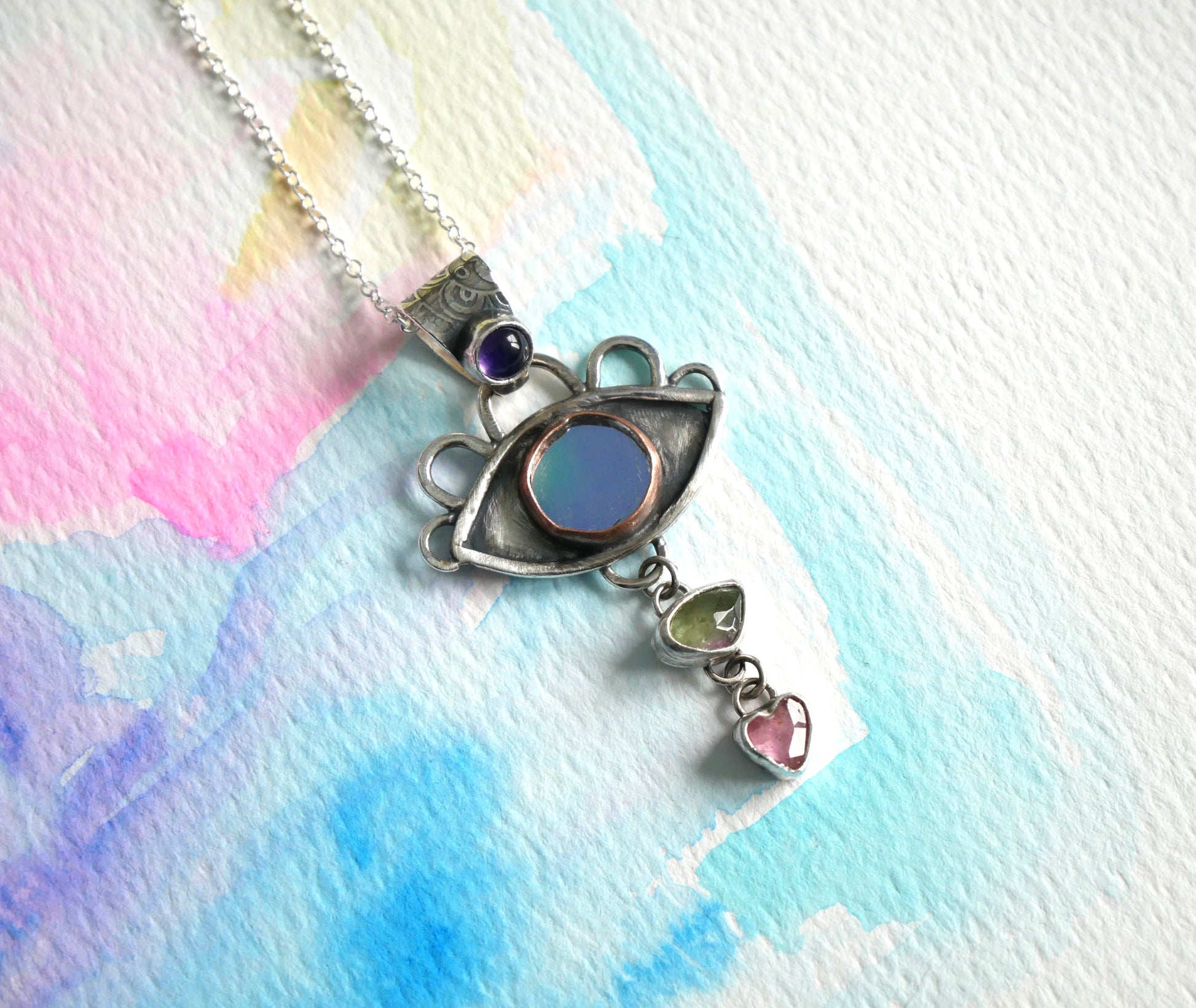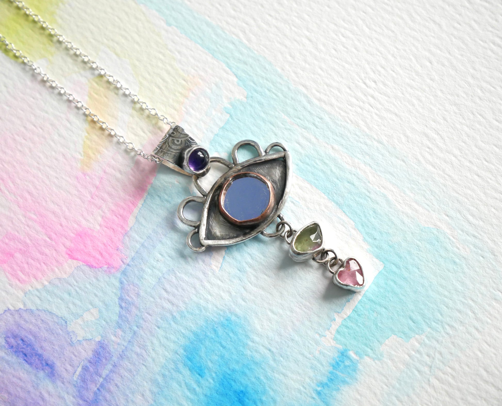 Look within pendant in sterling silver and copper with sushi mirror, Amethyst and Tourmalines