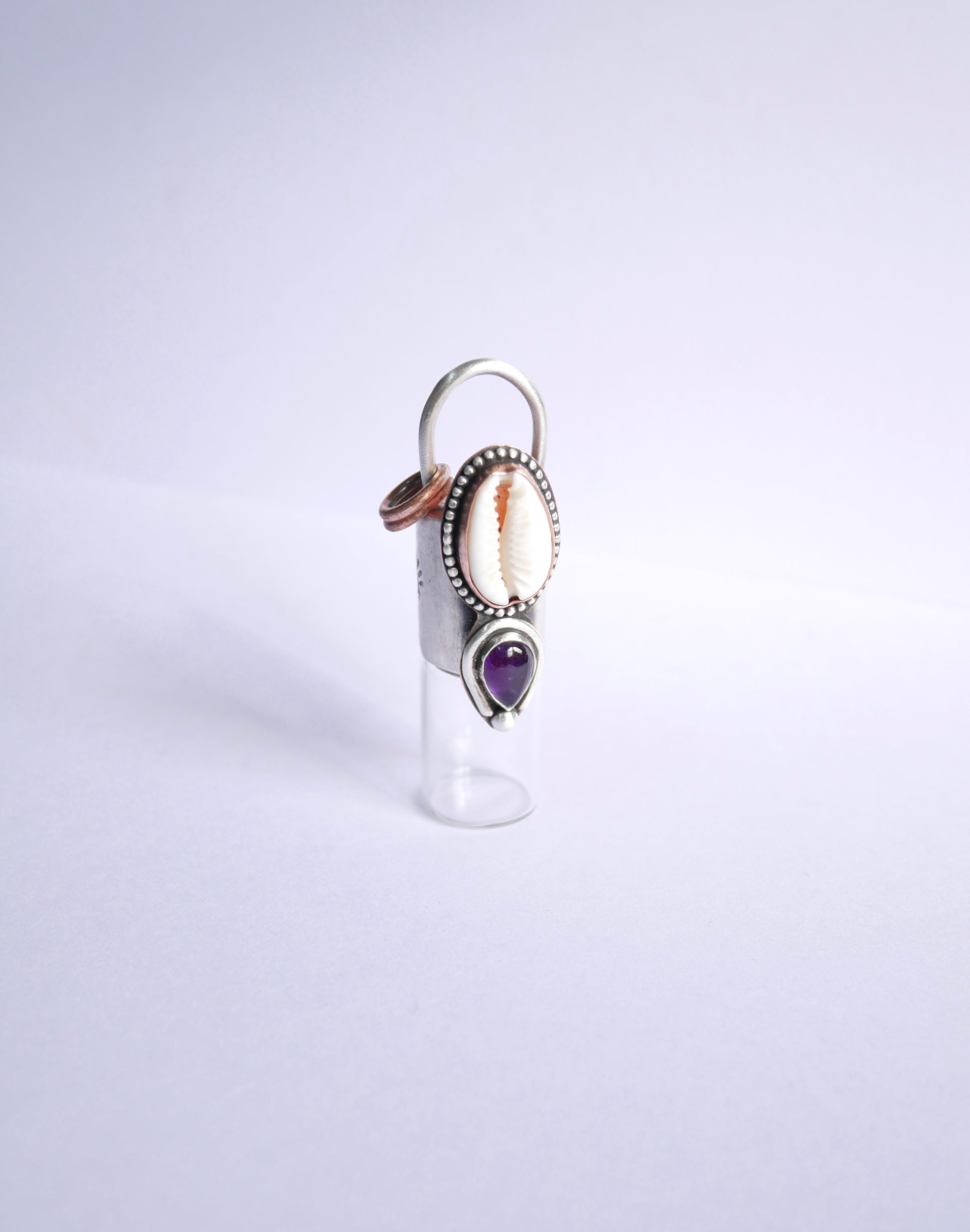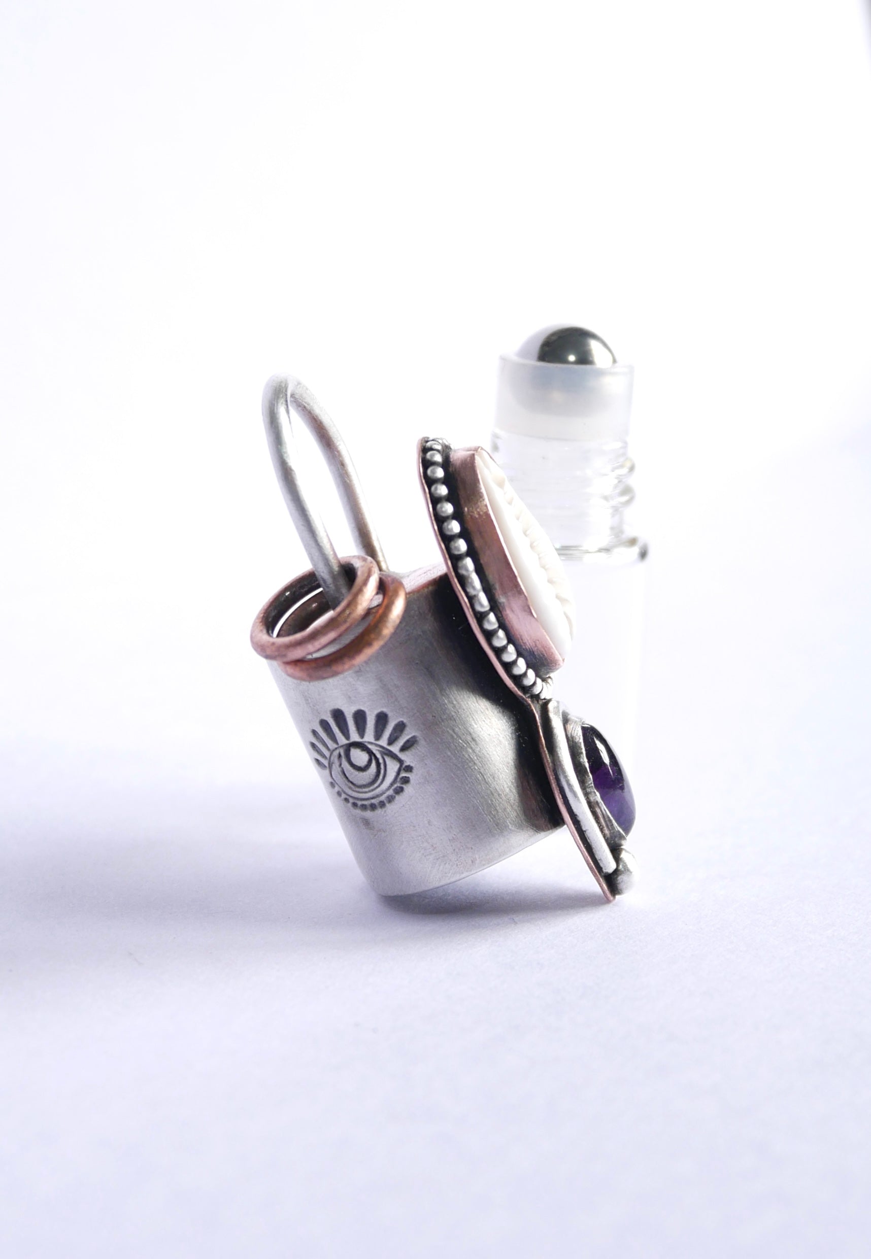 Custom roller bottle with Cowrie shell and Amethyst in sterling silver and copper